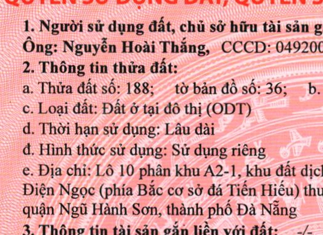 8mx37.5m, dất ở lâu dài, đối diện bãi tắm sơn thủy, gần resort hyatt. Phía trước có vịnh đỗ xe, đất trống. Lh 0983292529